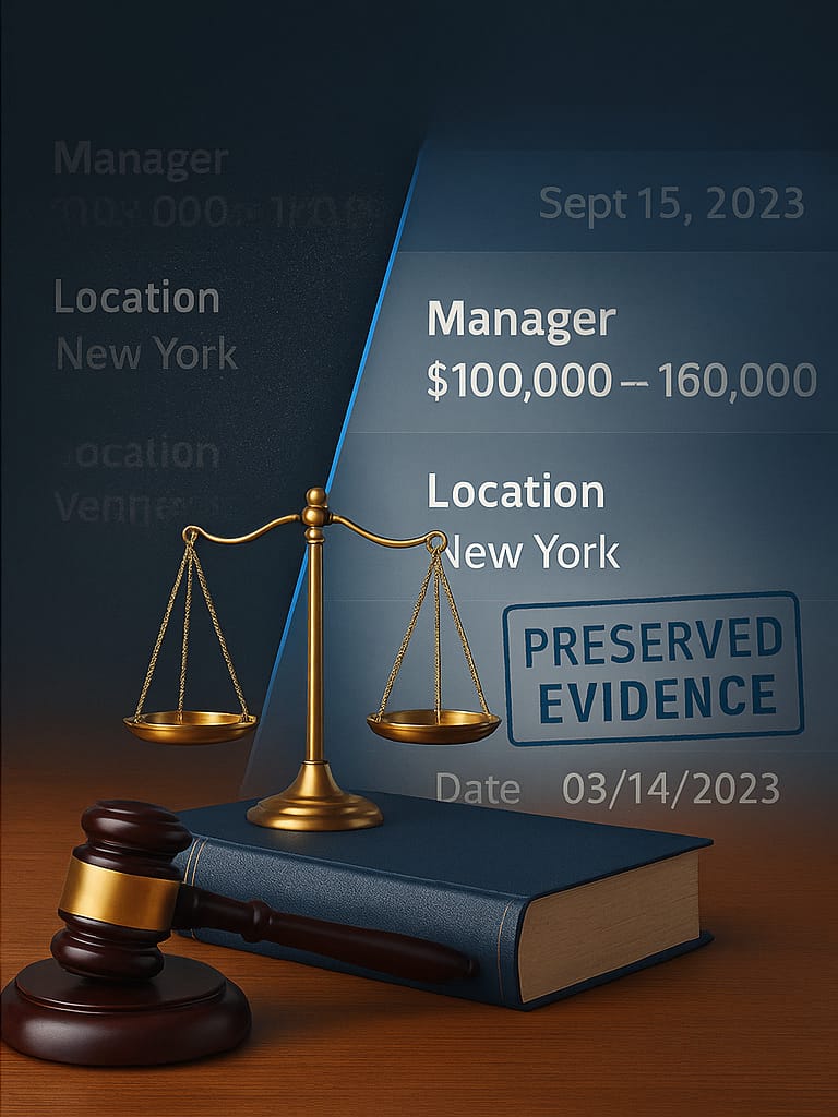 PrecisOne captures and preserves job postings with salary ranges, including full descriptions, scope, and geography. Each record is time-stamped, source-linked, and stored as verifiable evidence. Not surveys. Not averages. Not guesswork. The only defensible system of record built for legal, compliance, and compensation strategy.